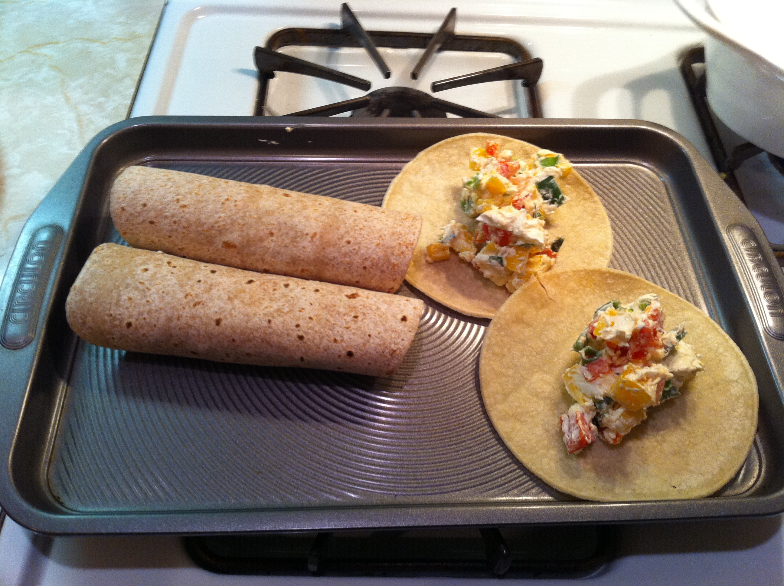 Mexican food is certainly a fan favorite in our house, but other than tacos we rarely cook it ourselves. I find a lot of recipes to be complicated and unhealthy. My fiancé came across this recipe, however, and it’s become a staple because it’s so simple and filling. With the cream cheese and breadcrumbs you could argue it’s not terribly healthy however we use reduced fat cream cheese and whole-wheat tortillas. You can also always choose whole wheat bread crumbs. Either way, it’s a vegetarian dish and only takes about 15 minutes to make total. So there ya have it! Enjoy.
